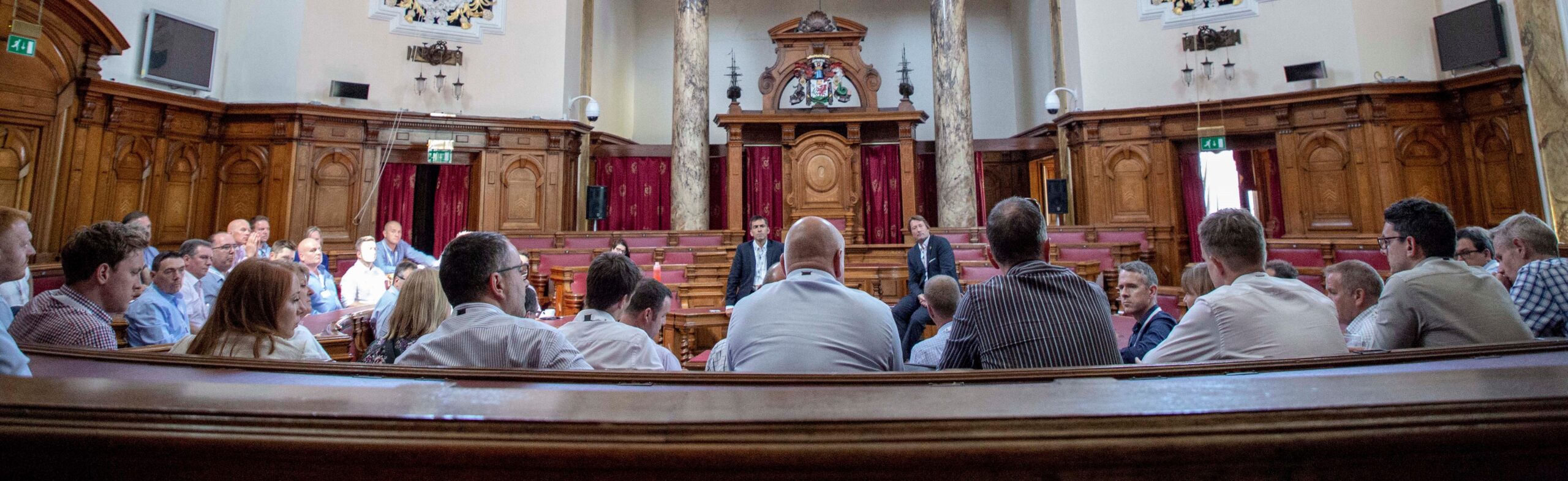 Paul Toyne facilitating a discussion within the debating chamber of Cardiff City Hall